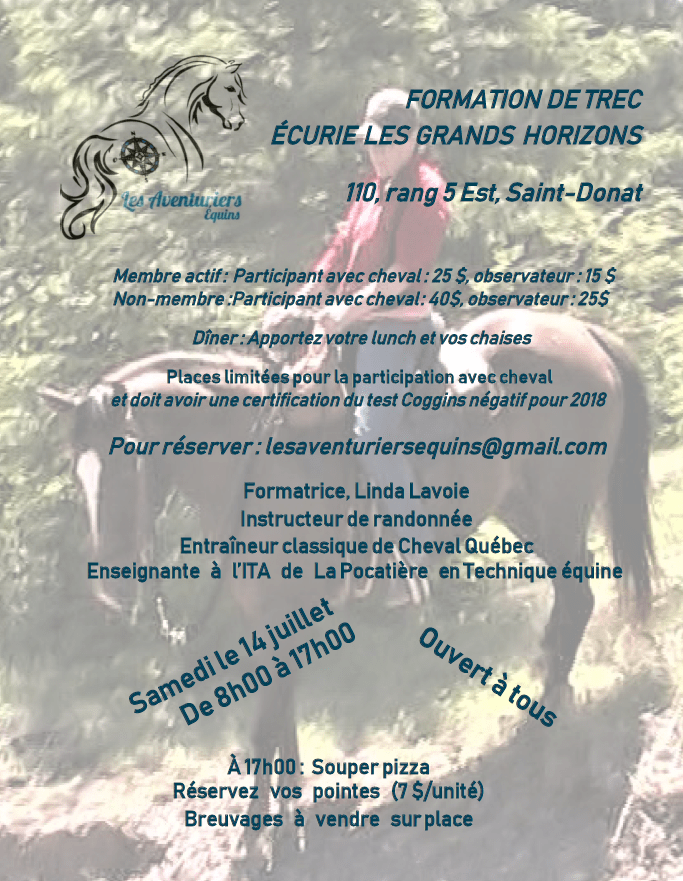 L’association Les Aventuriers Équins vous invite, à titre de participant ou d’observateur, à l’Écurie Les Grands Horizons, 110, rang 5 Est, Saint-Donat, à une journée de formation en TREC donnée par madame Linda Lavoie, instructeur de randonnée, entraîneur classique de Cheval Québec et enseignante à l’ITA de La Pocatière en Technique équine.