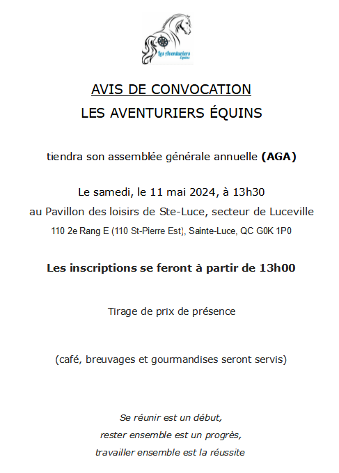 2024-05-112024-05-31lesaventuriersequinsLaisser un commentaire sur Avis de convocation – Assemblée générale annuelle 2024 Avis de convocation – Assemblée générale annuelle 2024 avis-convocationTélécharger Partager : Cliquer pour partager sur X(ouvre dans une nouvelle fenêtre) X Cliquez pour partager sur Facebook(ouvre dans une nouvelle fenêtre) Facebook J’aime chargement… Similaire